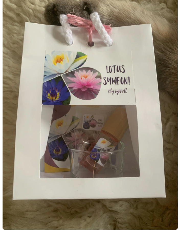 Gavepose med 5ml duftolie, glasholder, krystaller og lille fint hæfte med beskrivelse af olien og indholdet i olien.
