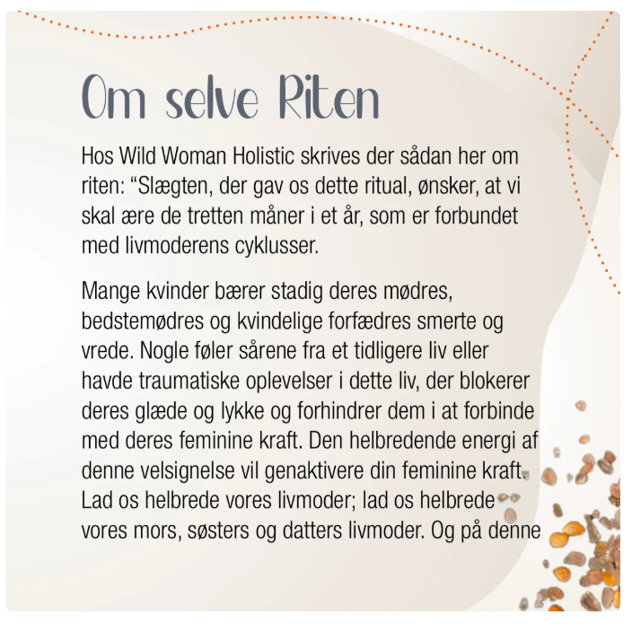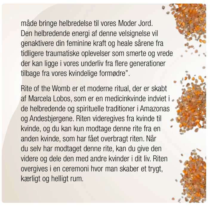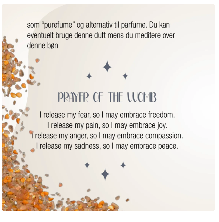 – UdsolgtDenne duftolie er udviklet og inspireret af ritualet "Rite of the Womb", som er en kaftfuld og kærlig energitransmission, som genopretter og velsigner den naturlige balance i underlivet, som er et helligt skabelsesceter fyldt med skaberkraft og kreativitet.