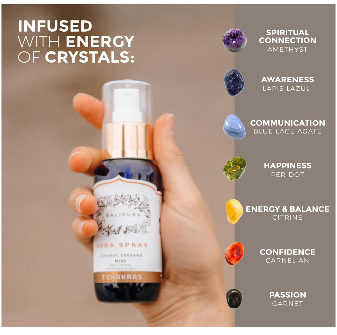 7 Chakras Aura Spray støtter balancen og harmoniseringen af dine energicentre. Den arbejder gennem auraen og er sammensat til at virke i synergi med alle 7 hovedchakraer – renser blokeringer og genetablerer energiens naturlige flow.